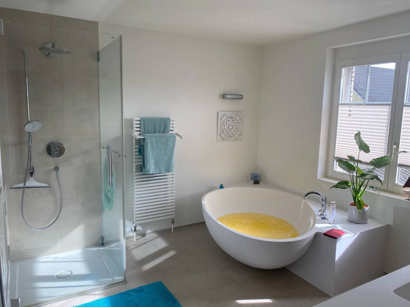 Dieses Badezimmer wurde komplett saniert. Die bodenebene Dusche und die freistehende Badewanne wurden neu installiert.